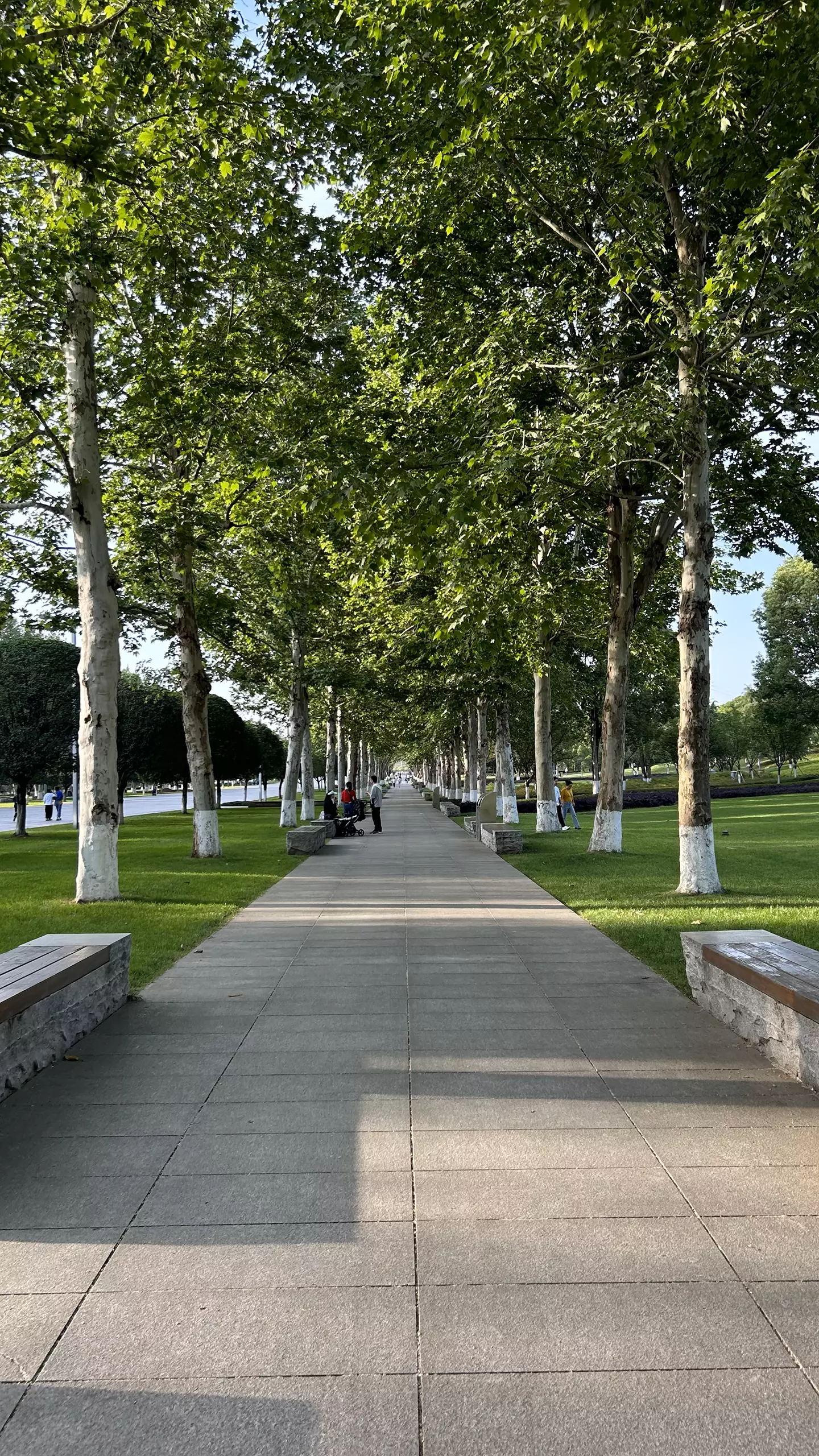 市民休闲广场两侧,数百米的林荫步道和圆形景观树木所构成了别致的风景,吸引了大量人群漫步和休憩。