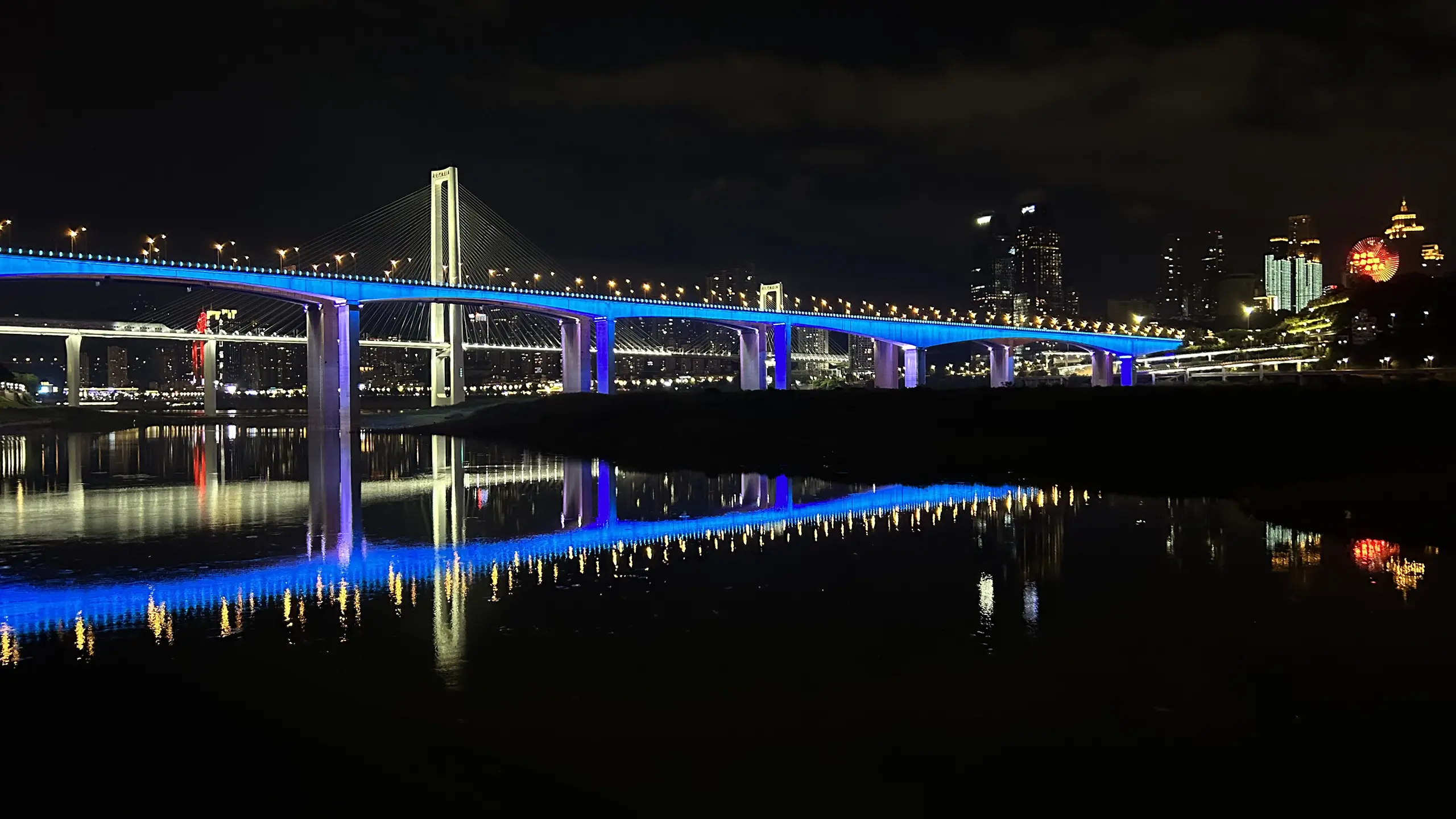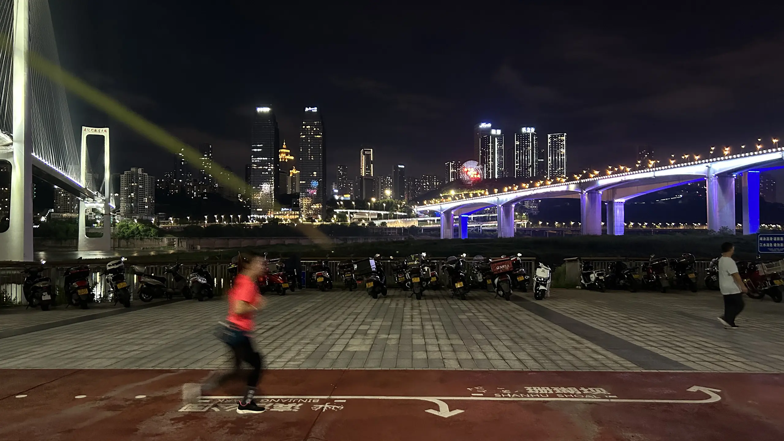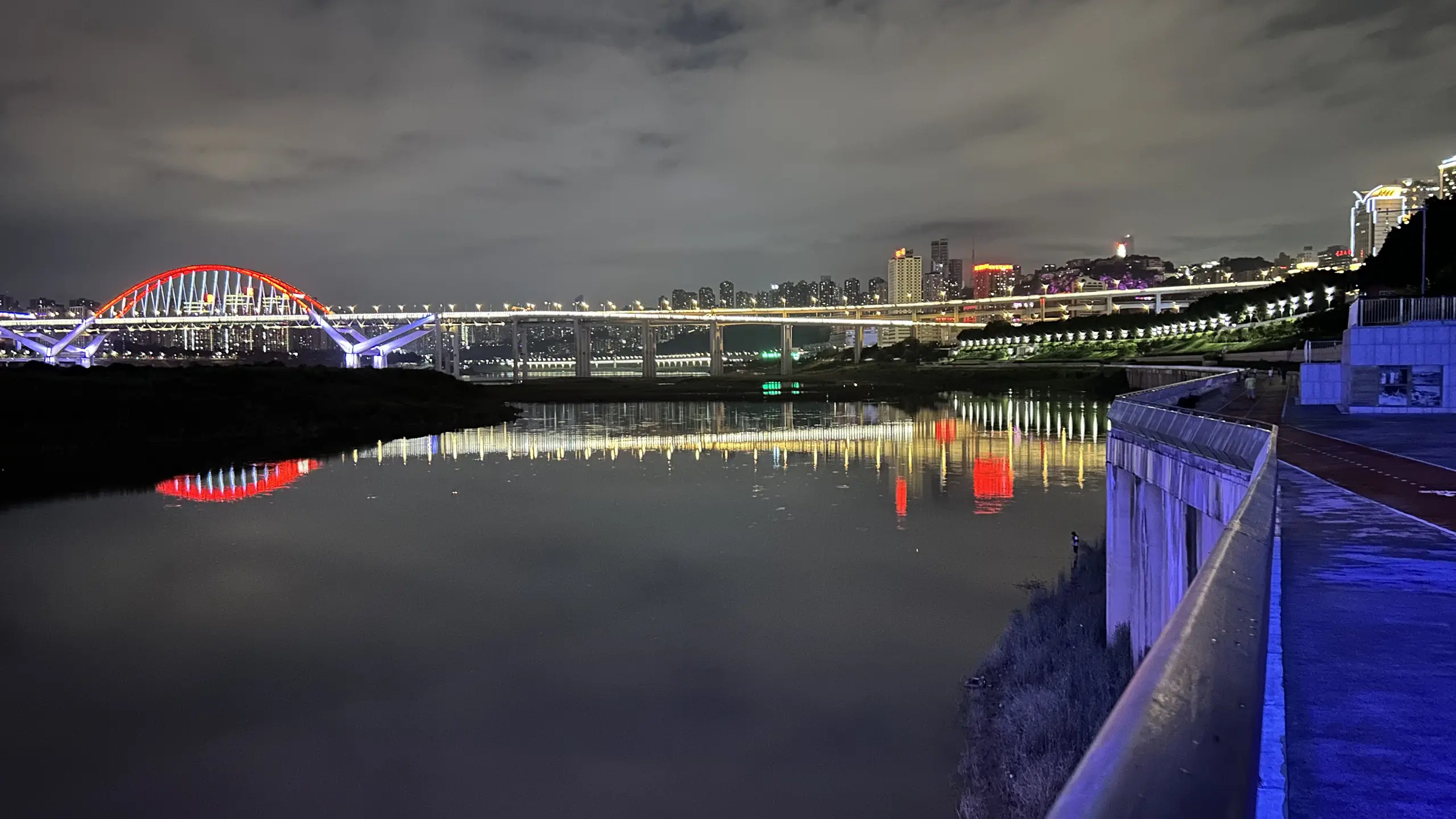 继续向西前进,菜园坝大桥巨大的红色拱顶成了远处这片迷离夜景中最骚气的点缀。得益于重庆两江四岸精细化改造工程的推进,昔日落魄的菜园坝沿江一带,又重新绽放出了城市的灯火辉煌。