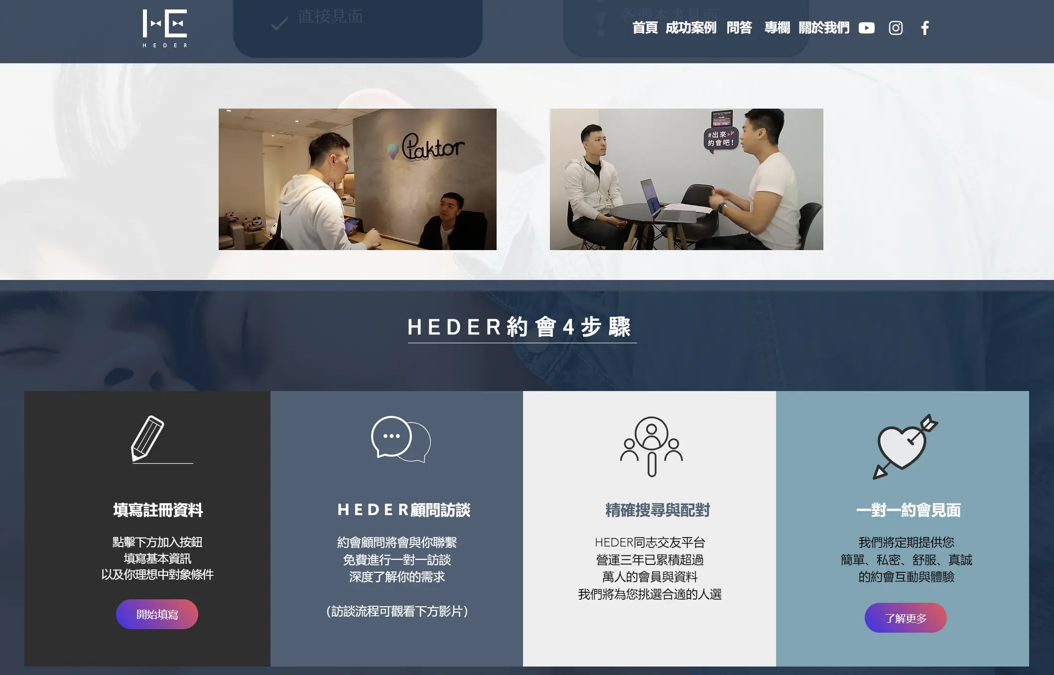 Heder是一个为台湾基友提供真人相亲服务的平台,主打线下约会面对面的方式进行沟通和认识,将基友们的脱单活动,从线上拓展到线下,营造更加真实和有温度的基友约会体验。
