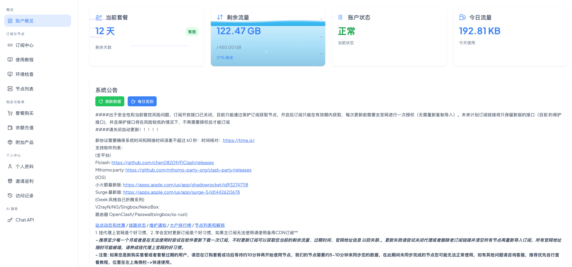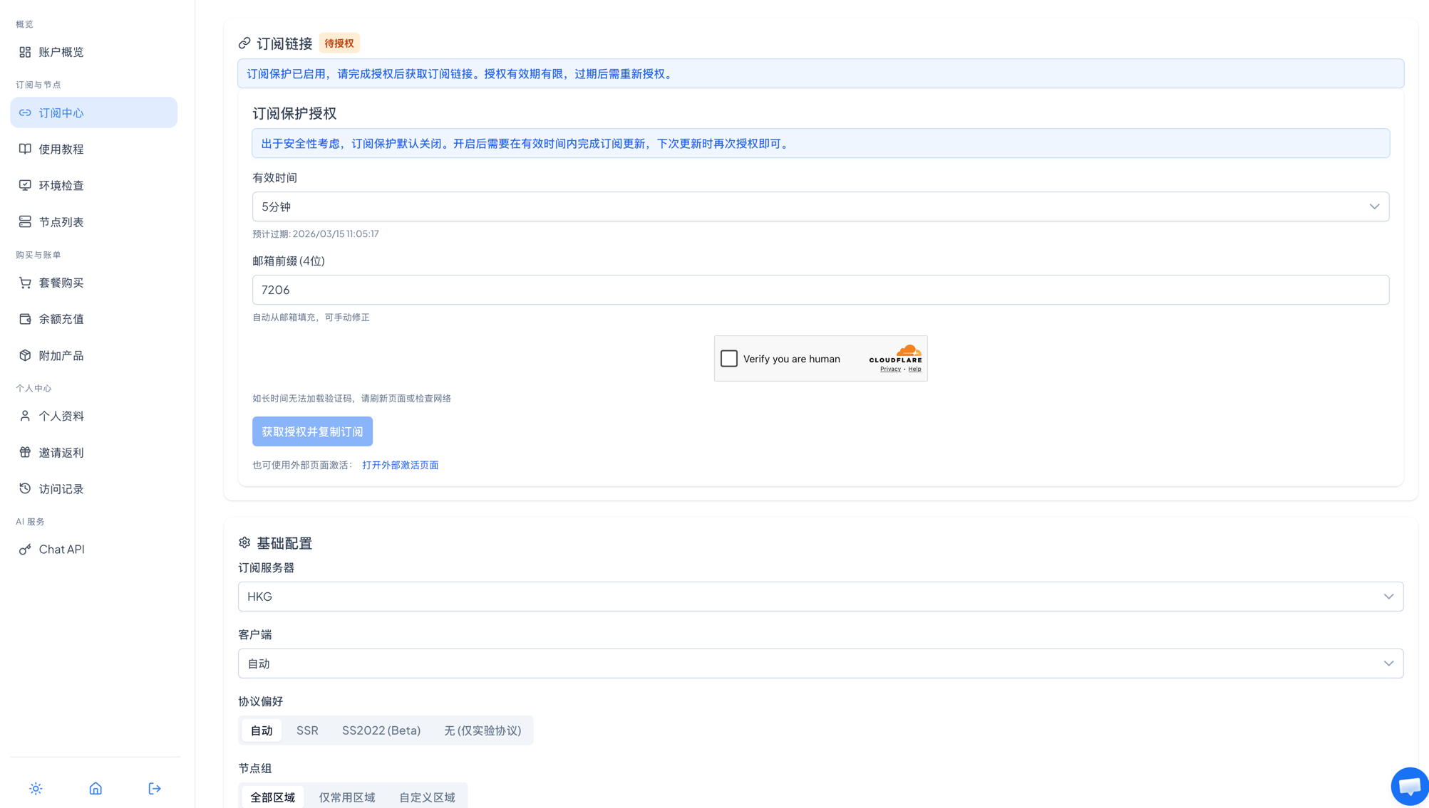 保护机制是跑路云的一个纠结点。跑路云有个默认的订阅保护机制,可以一定程度防止你的订阅被别人盗用,即便盗用,一段时间后盗用者也将面临订阅节点无法更新的囧地,自动放弃继续盗用。但是,这个功能一定程度上,也会造成我们长期没有更新订阅后,需要进入后台到订阅中心手动授权一下,自己才能才能更新订阅。还好这个操作不麻烦,只是点两下,就可以重新刷新订阅了。