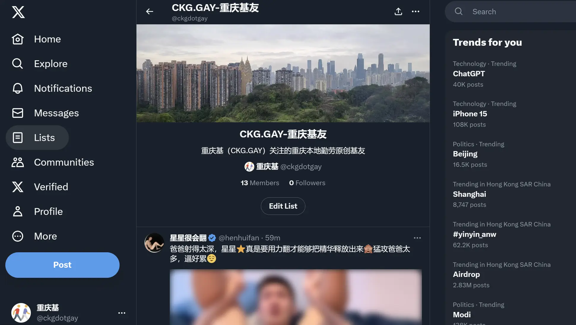 懒逼要问了:如何能一键关注所有高质量重庆本地推主呢?基宝宝告诉大家哦,只要关注基宝宝维护的「CKG.GAY-基友」列表,就可以一键关注重庆那些更新频率较高,且原创内容较多的推主啦。