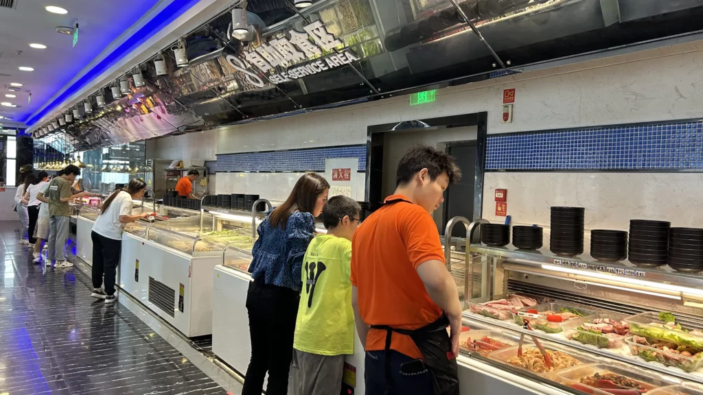 饮料自选区转角即是食品自选区,一整排摆放整齐的肉类、串类、素菜、熟食、主食,都是勾人长胖的罪恶之源,想拒绝又无能为力,随手抓一个冷藏柜上方的小碗就准备再长一斤肉呢。